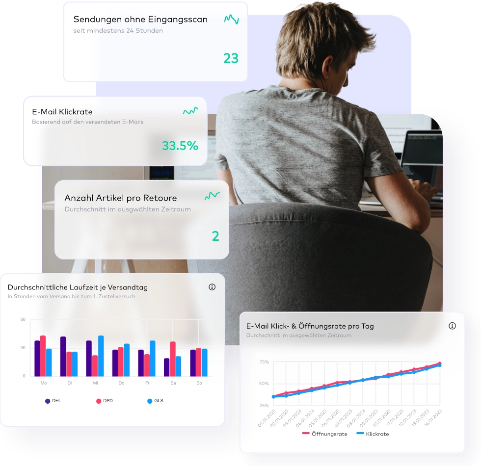 Das vollautomatisiertes Retourenportal hilft dabei, eine reibungslose Retourenabwicklung zu gewährleisten. Durch detaillierte Auswert-ungen zu Retourengründen und zurückgesendeten Artikeln, kann die Retourenquote nachhaltig reduziert und Kosten gesenkt werden.