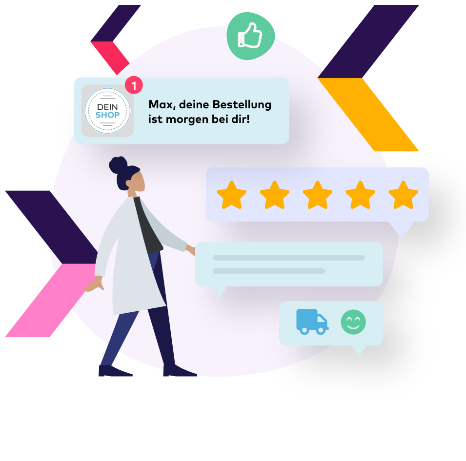 Nutze diese hohe Aufmerksamkeit deiner Kunden und stärke durch positive Nachrichten die Kaufentscheidung. Wie und in welchem Umfang du deine Kunden informieren möchtest, entscheidest du. Wähle aus über + 30 unterschiedlichen Messages genau die Nachrichten aus, die deine Kunden während der Paketreise erhalten sollen. Ob per E-Mail, SMS, WhatsApp, Social Media Messages oder Push-Notification. Personalisiere deine Kundenansprache und integriere Services, wie Wunschtermin, Wunschort und Adressänderung deiner Versanddienstleister.